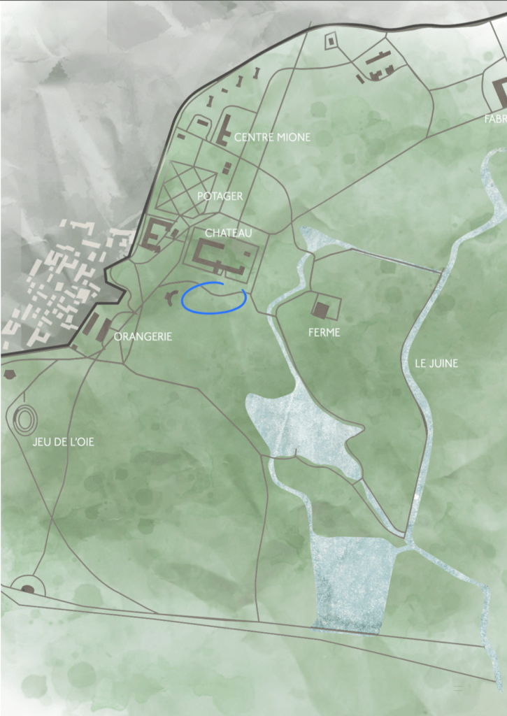 Plan de masse et plan d’implantation dans le Domaine de Chamarande.